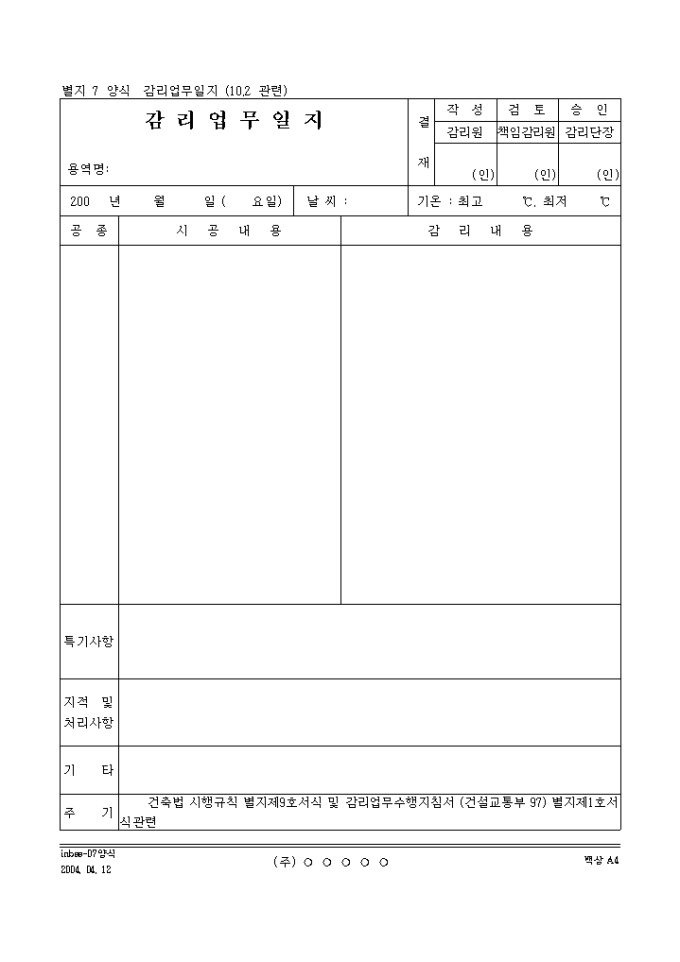 공종별 시공내용, 감리내용을 기록하는 감리업무일지입니다.