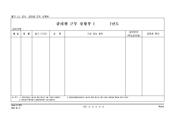 9,000원/월일자별,종별,시간,성명,사유 또는 용무,감리단장명,감독관 확인으로 구성된 감리원 근무 상황부입니다.