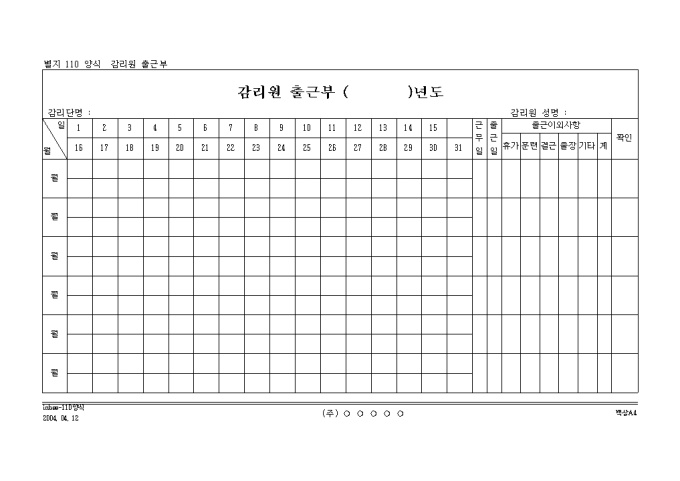 일자별 감리원의 출근상황을 기록하는 감리원 출근부입니다.
