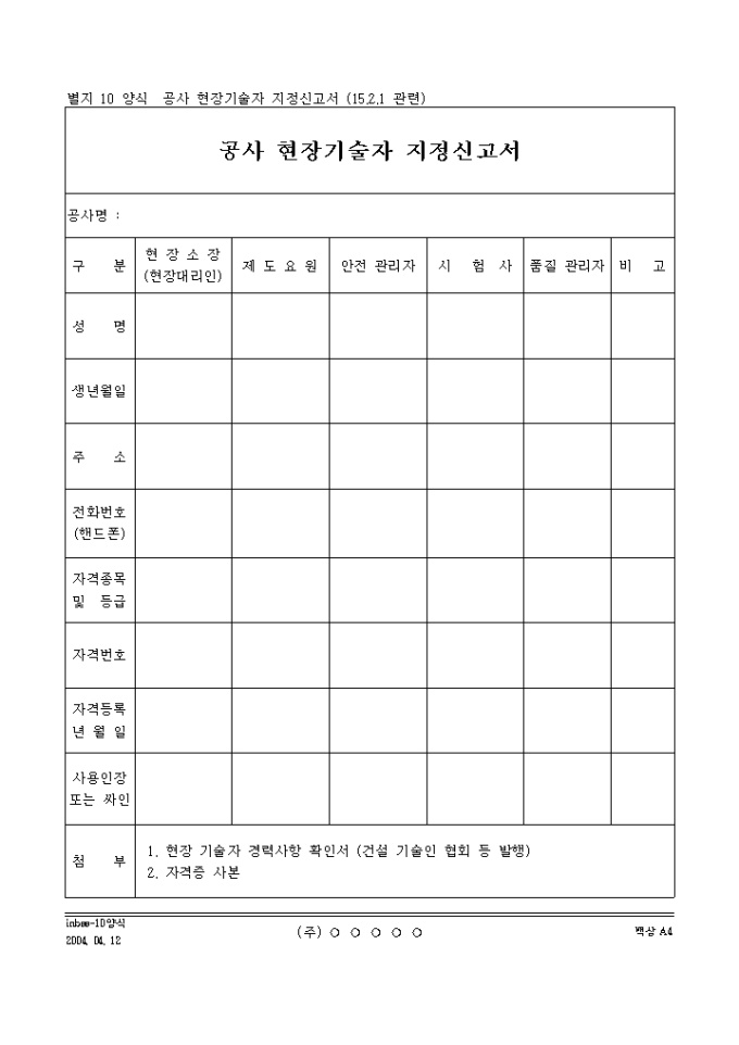 9,000원/월공사 현장 기술자의 성명,생년월일,주소,전화번호,자격종목 및 등급등을 기록하는 공사 현장기술자 지정신고서입니다.