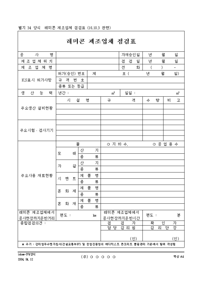 9,000원/월레미콘 제조업체의 업체명,위치,주요생산 설비현황,주요시험기기,주요사용 재료현황등을 기록하는 양식입니다.