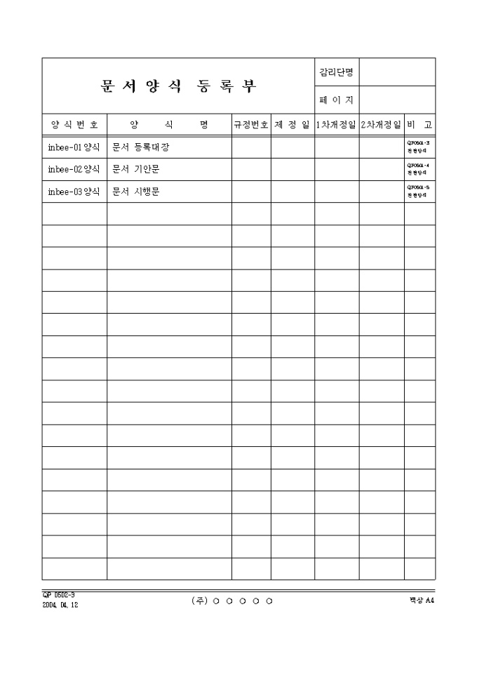 9,000원/월양식번호,양식명,규정번호,제정일,비고란으로 구성된 문서양식 등록부입니다.