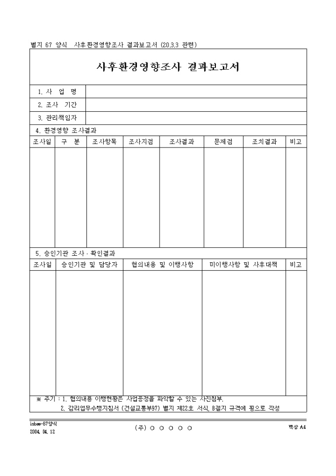 9,000원/월사업명,조사기간,관리책임자,환경영향 조사결과,승인기관 조사 및 확인결과를 기록하는 사후환경영향조사 결과보고서입니다.