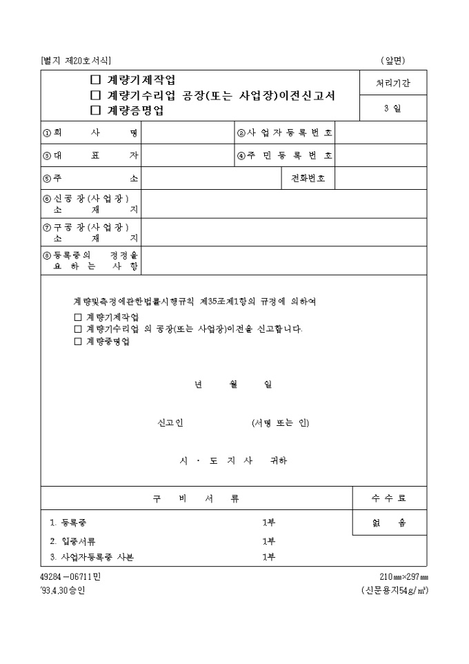 (계량기제작업, 계량기수리업, 계량증명업)공장(또는 사업장)이전신고서