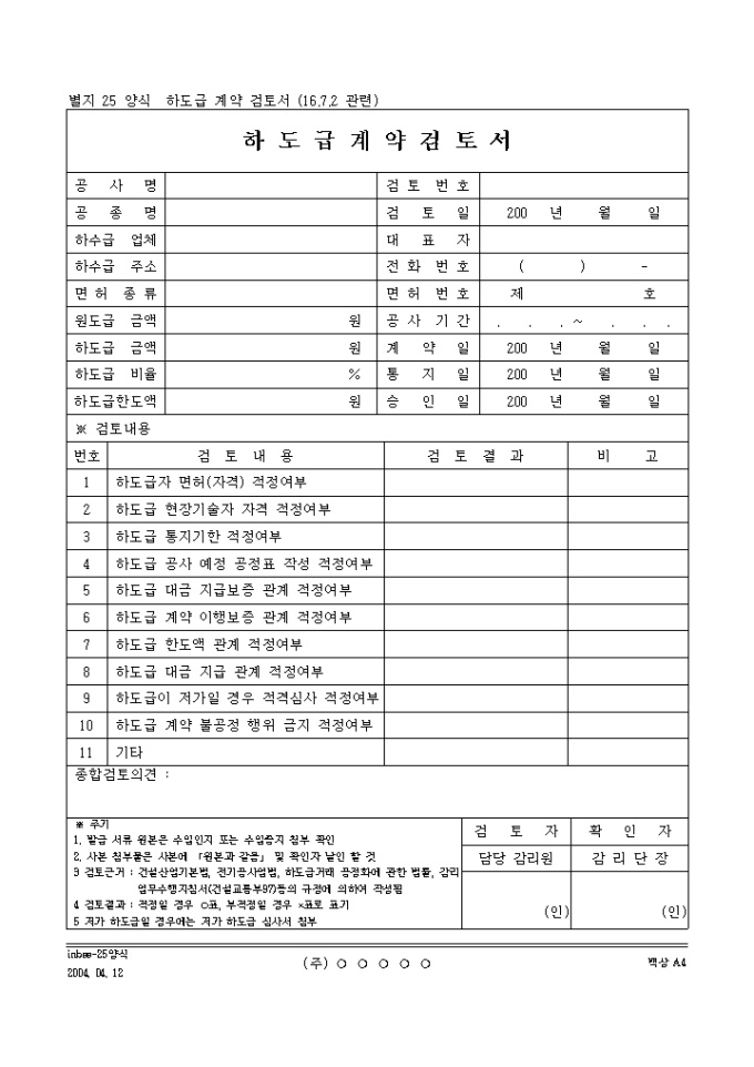 하도급 계약 검토서