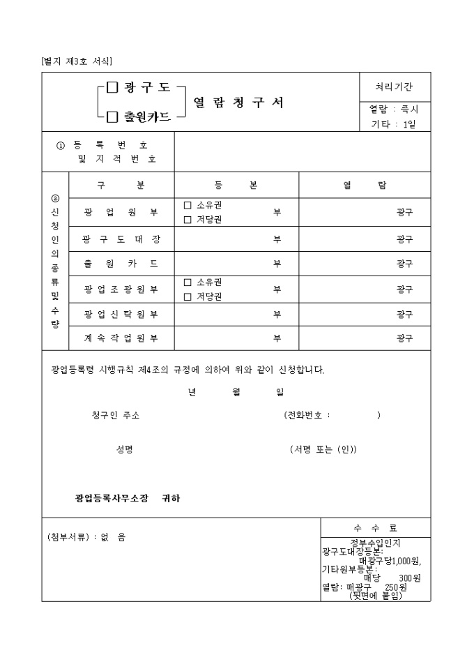 9,000원/월광업등록령 시행규칙 제4조의 규정에 의하여 위와 같이 신청하고자 할 때 사용하는 "(광구도, 출원카드) 열람청구서" 양식입니다.