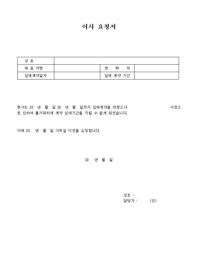 9,000원/월사무실임대계약 기간을 채우지 못하고 이전을 해야할때 관리사무소에 이사 요청을 할때 사용할 수 있는 양식입니다.