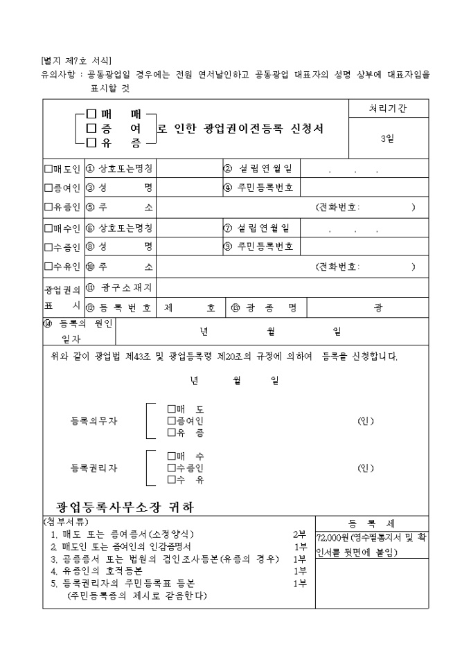 9,000원/월광업법 제43조 및 광업등록령 제20조의 규정에 의하여 등록을 신청하고자 할 때 사용하는 "(매매,증여,유증)로 인한 광업권 이전 등록신청서" 양식입니다.