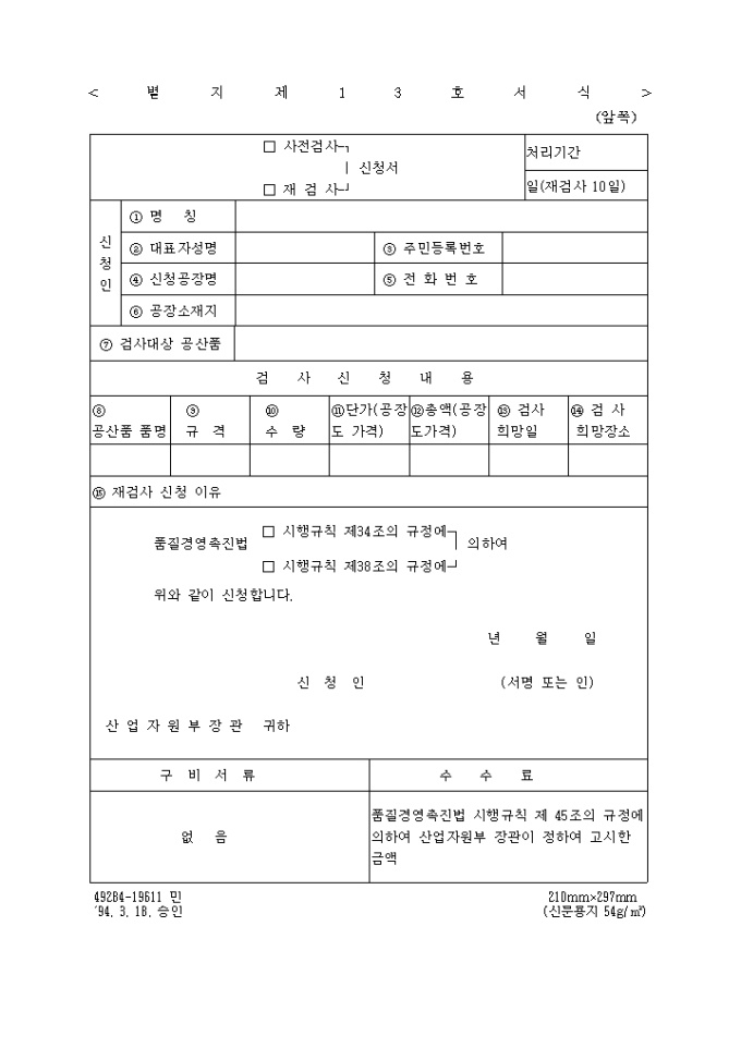 품질경영촉진법 (□ 시행규칙 제34조 □ 시행규칙 제38조)의 규정에 의하여 위왁 ㅏㅌ이 신청하고자 할 경우 사용하는 "(사전검사,재검사) 신청서" 양식입니다.