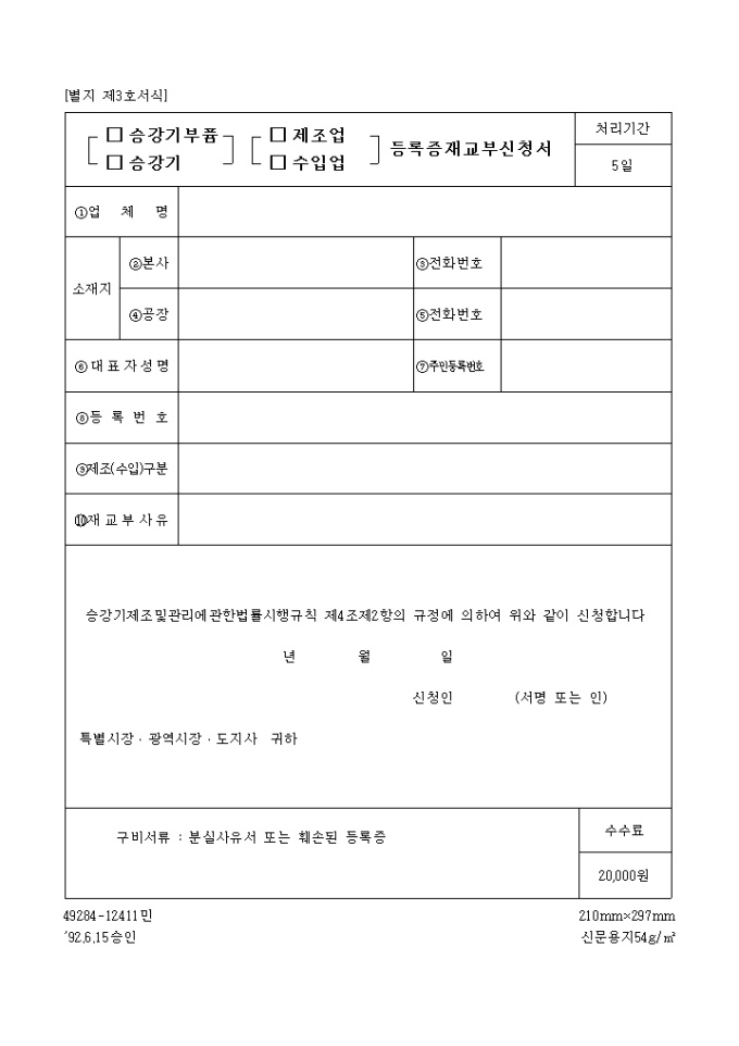 9,000원/월승강기제조및관리에관한법률시행규칙 제4조제2항의 규정에 의하여 위와 같이 신청하고자 할 때 사용하는 "(승강기부품,승강기,제조업,수입업)등록증 재교부신청서" 양식입니다.