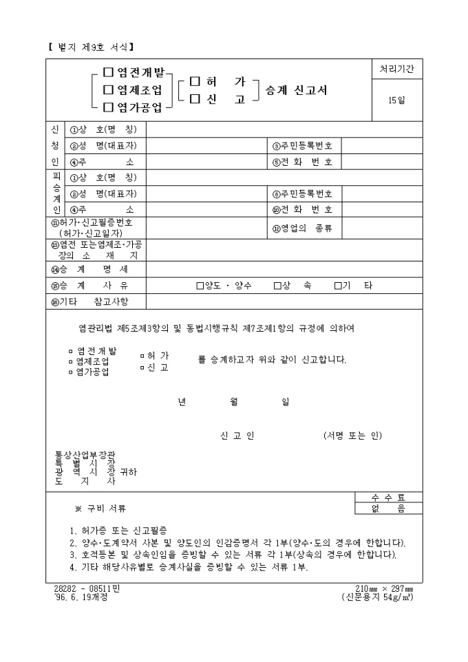 (염전개발, 염제조업, 염가공업, 허가, 신고)승계신고서