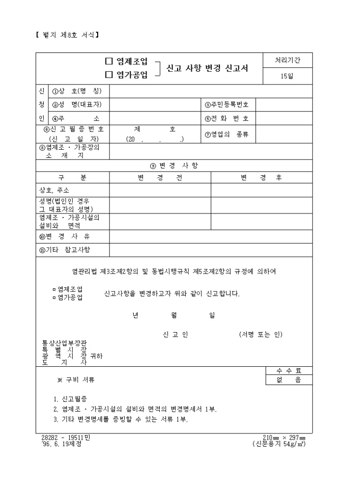 9,000원/월염관리법 제3조제2항의 및 동법시행규칙 제5조제2항의 규정에 의하여 (염제조업, 염가공업) 신고사항을 변경하고자 위와 같이 신고하실 때 사용하는 "(염제조업, 염가공업) 신고사항 변경신고서" 양식입니다.