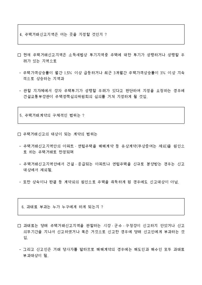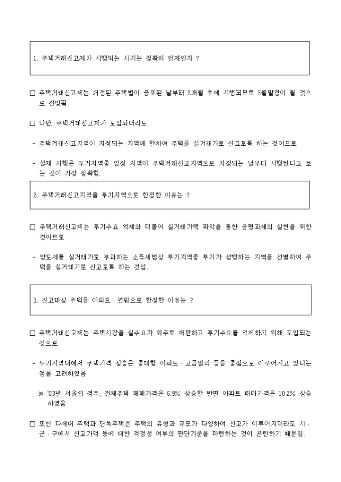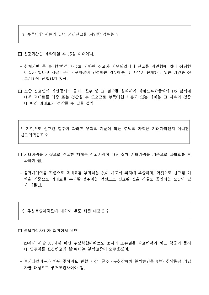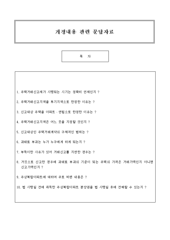 주택거래신고제 시행에 대한 관련 자료가 기술되어 있는 개정내용관련문답자료 양식입니다.