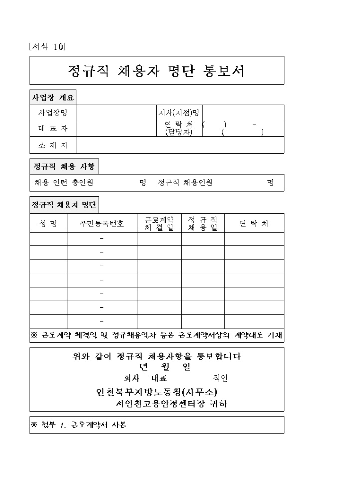 인턴취업지원제 정규직 채용자 명단 통보서