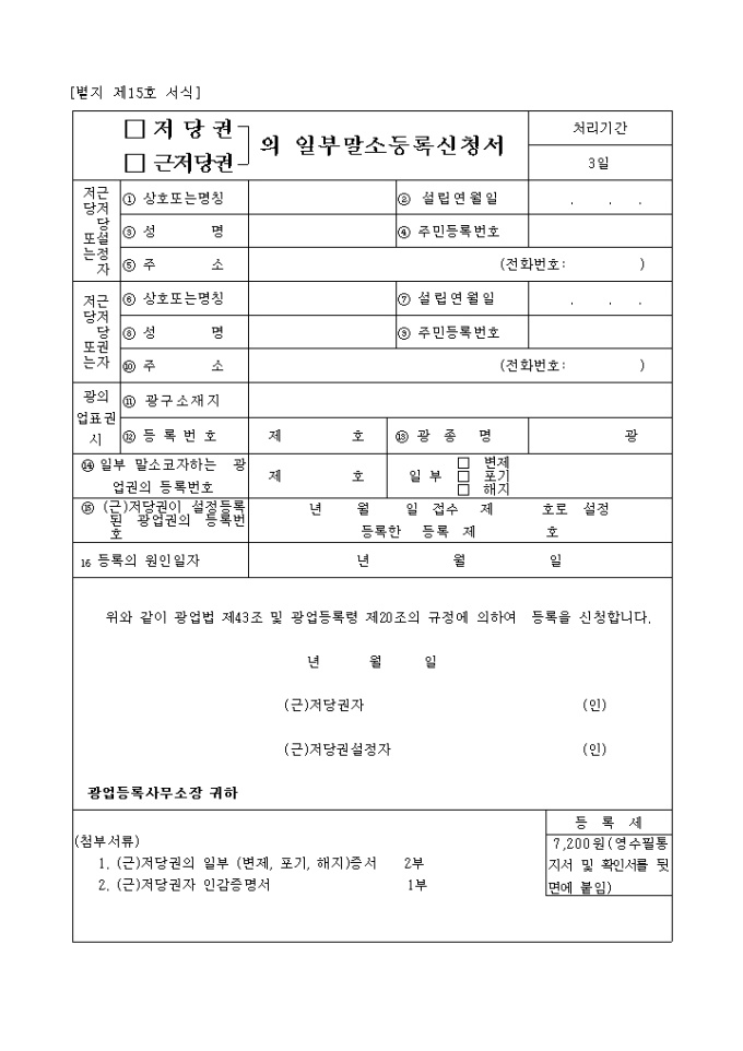 광업법 제43조 및 광업등록령 제20조의 규정에 의하여 등록을 신청하실 때 사용하는 "(저당권,근저당권)의 일부 말소 등록신청서" 양식입니다.