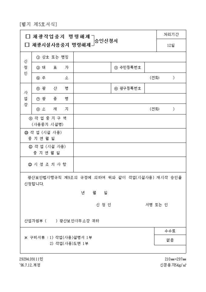 (채광작업중지명령해제, 채광시설사용중지명령해제)승인신청서