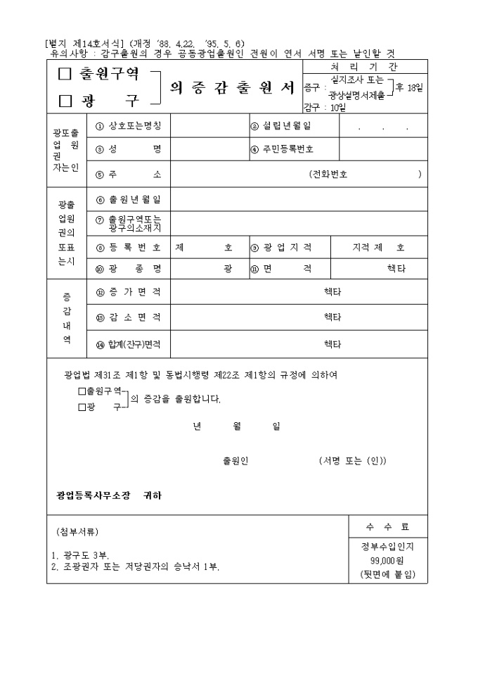 광업법 제31조 제1항 및 동법시행령 제22조 제1항의 규정에 의하여 (출원구역, 광구)의 증감을 출원하고자 할 때 사용하는 "(출원구역,광구)의 증감출원서" 양식입니다.