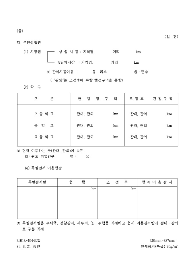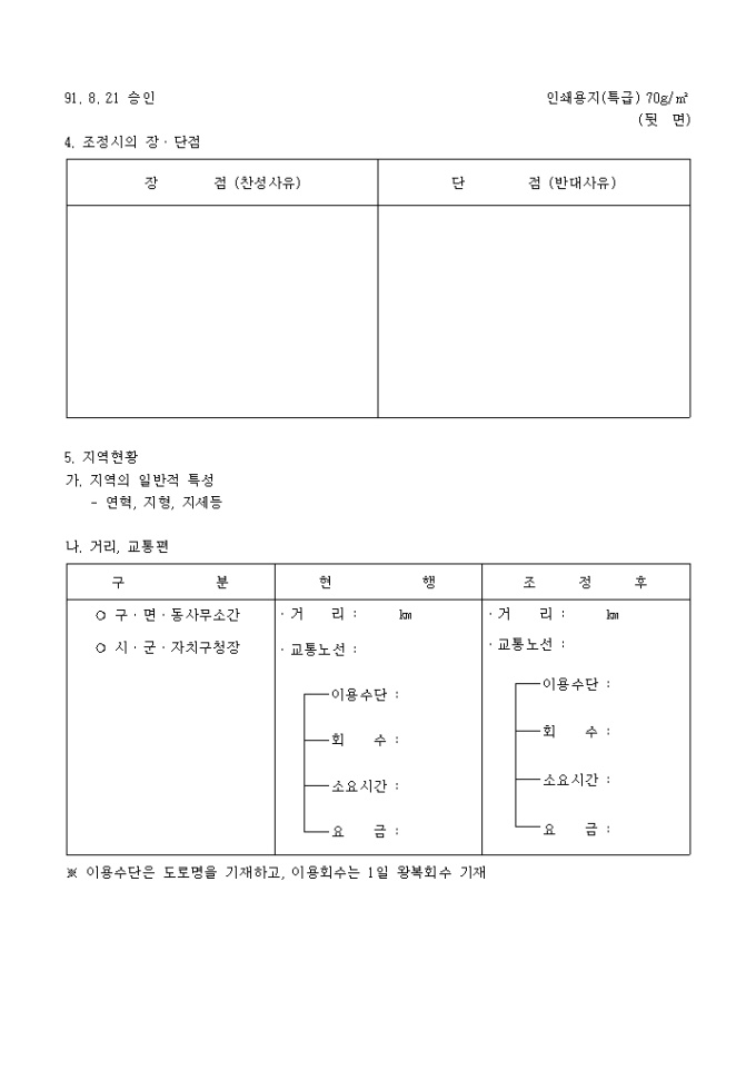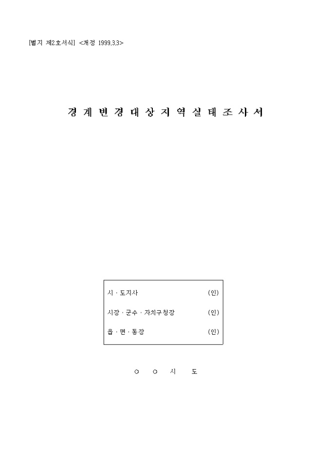 9,000원/월행정구역조정업무처리에관한규칙 별지2호 서식입니다. 1. 대상지역 2. 조정사유 (구체적으로 기재) 3. 조정규모 4. 조정시의 장ㆍ단점 5. 지역현황 6. 개발권역과의 관계 7. 행정구역의 공동사회성 8. 경계획정수단...