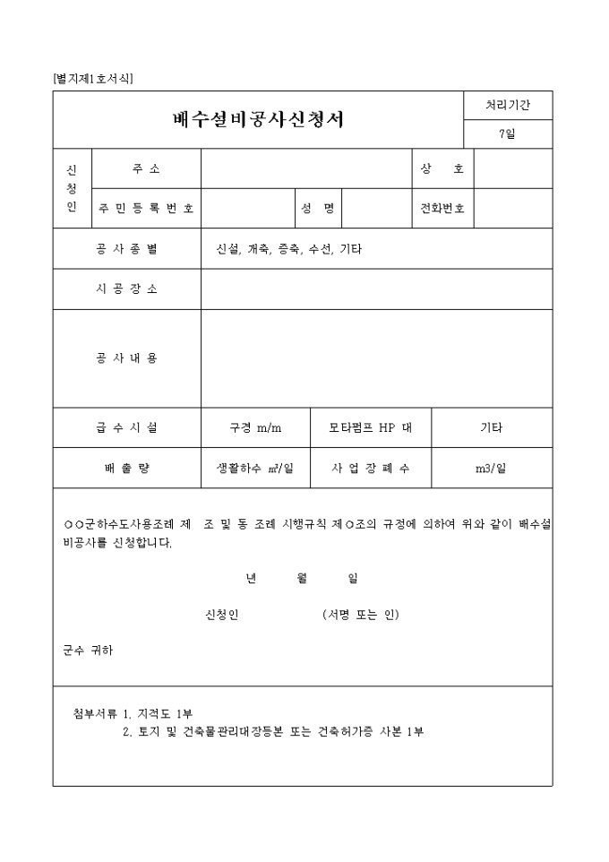 배수설비공사 신청서 시, 군청등에 신청하는 양식입니다. 지방자치단체에서 각각 규격화한 서식이므로 각 지방마다 다를 수 있습니다. 정확한 양식은 해당 지방자치단체 담당부서에 문의하시기 바랍니다.