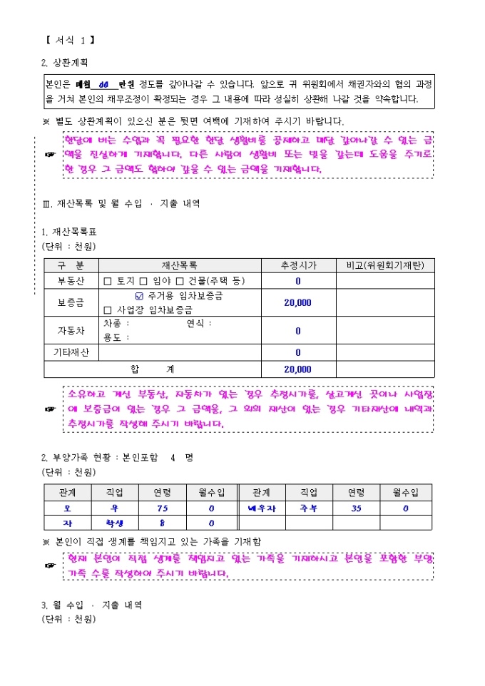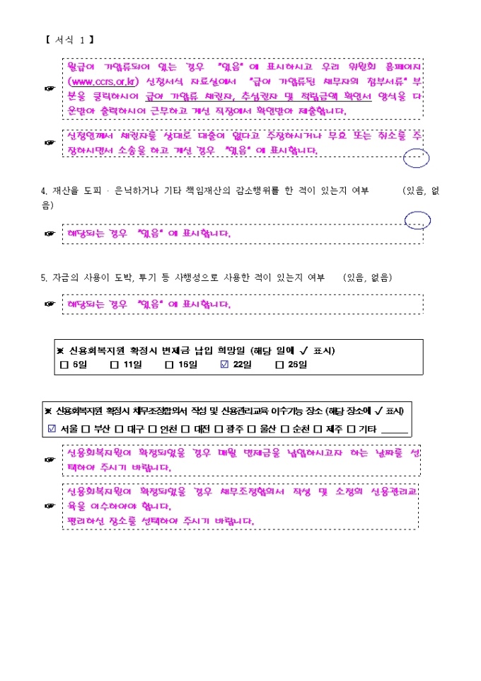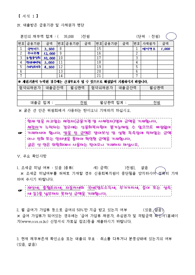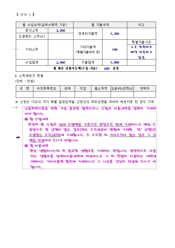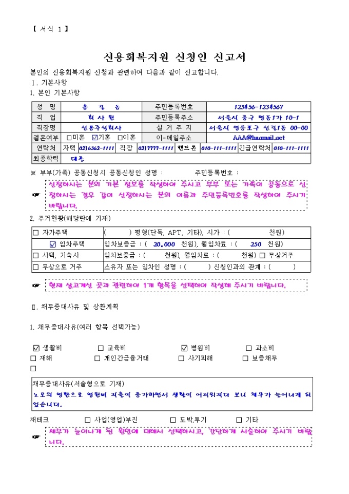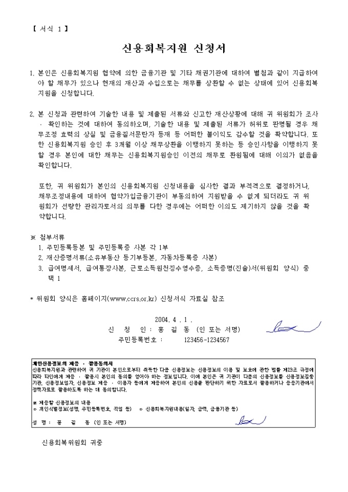 신용회복지원 협약에 의한 금융기관 및 기타 채권기관에 대하여 별첨과 같이 지급하여야 할 채무가 있으나 현재의 재산과 수입으로는 채무를 상환할 수 없는 상태에 있어 신용회복지원을 신청하는 신청서 작성요령 및 예시 양식입니다.