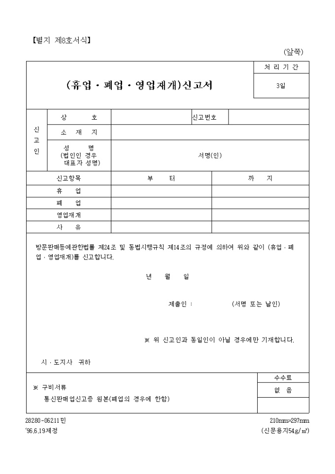9,000원/월방문판매등에관한법률 제24조 및 동법시행규칙 제14조의 규정에 의하여 위와 같이 (휴업․폐업․영업재개)를 신고하고자 할 때 사용하는 "(휴업,폐업,영업재개)신고서-2" 양식입니다.