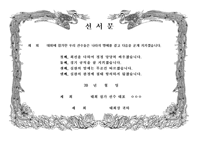 9,000원/월대회에 참가한 우리 선수들은 나라의 명예를 걸고 각조항을 굳게 지키겠다는 선서문 양식입니다.