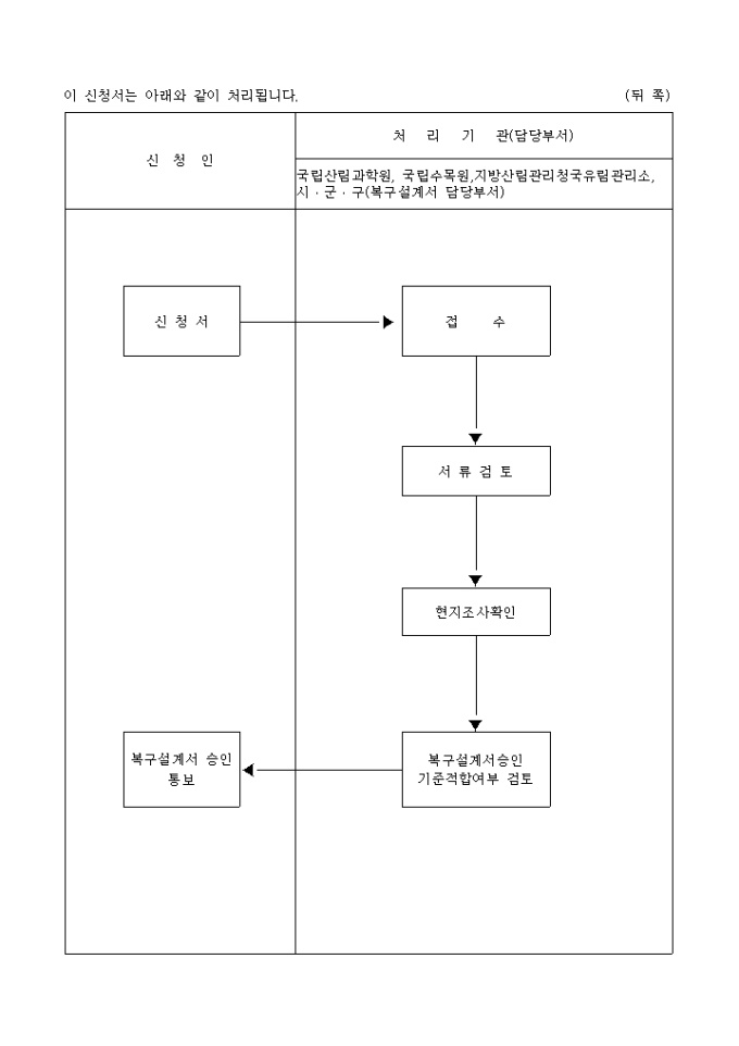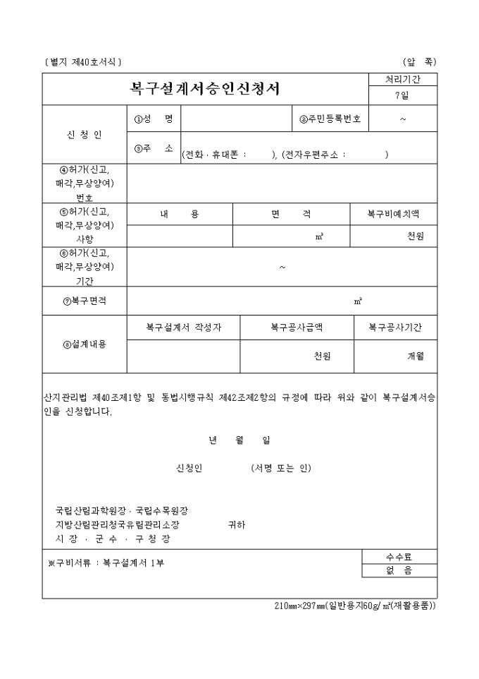 산지관리법 제40조제1항 및 동법시행규칙 제42조제2항의 규정에 따라 복구설계서승인을 신청할 때 사용하는 양식입니다.
