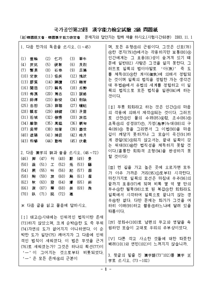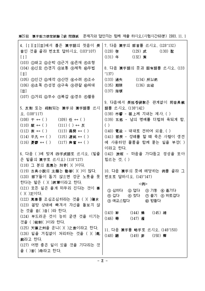 한자능력시험 기출문제 입니다. 第25回 漢字能力檢定試驗 2級