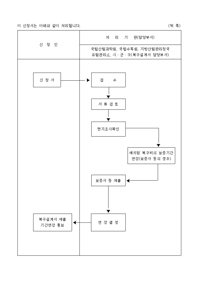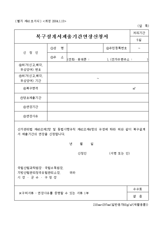 9,000원/월산지관리법 제40조제2항 및 동법시행규칙 제42조제4항의 규정에 따라 복구설계서 제출기간의 연장을 신청할 때 사용하는 양식입니다.