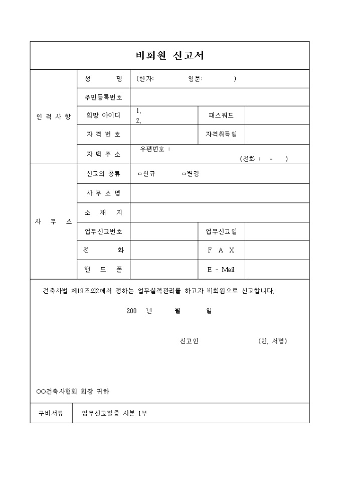 9,000원/월건축사법 제19조의2에서 정하는 업무실적관리를 하고자 비회원으로 신고할 때 사용하는 양식입니다.