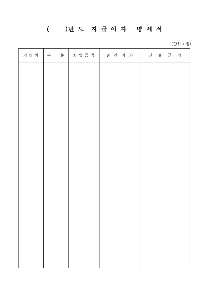 9,000원/월()년도 지급이자명세서에 관한 양식입니다. 거래처, 구분, 차입금액, 년간이자, 산출근거 등을 기재합니다.