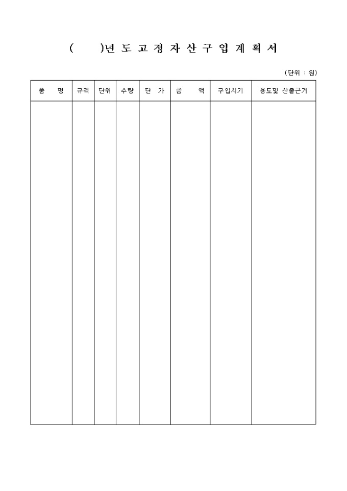 고정 자산 구입 계획서에 관한 양식입니다. 품명, 규격, 단위, 수량, 단가, 금액, 구입시기, 용도 및 산출근거 등을 기재합니다.