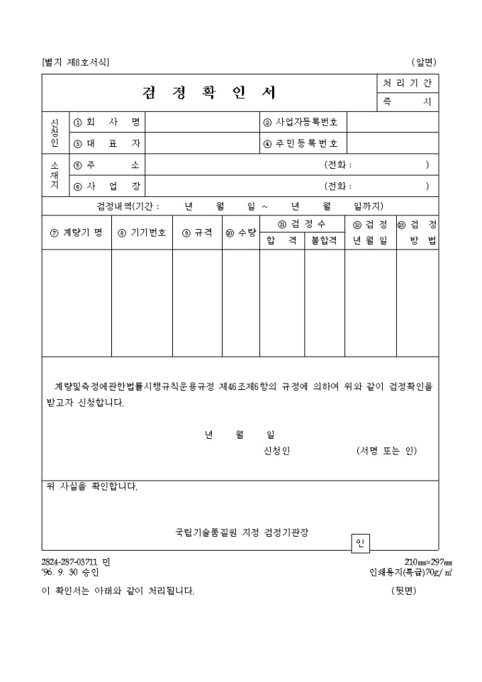 9,000원/월계량 및 측정에 관한 법률시행규칙운용규정 제46조제6항의 규정에 의하여 위와 같이 검정확인을 받고자 신청하고자 할 때 사용하는 검정확인서 양식입니다.