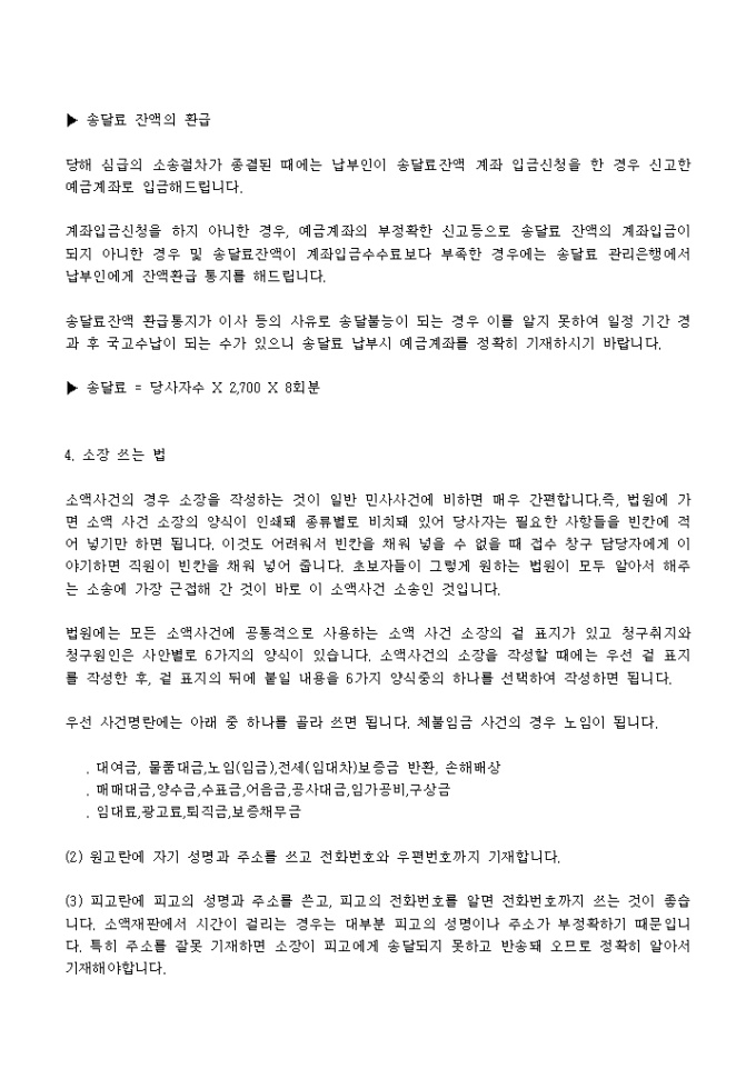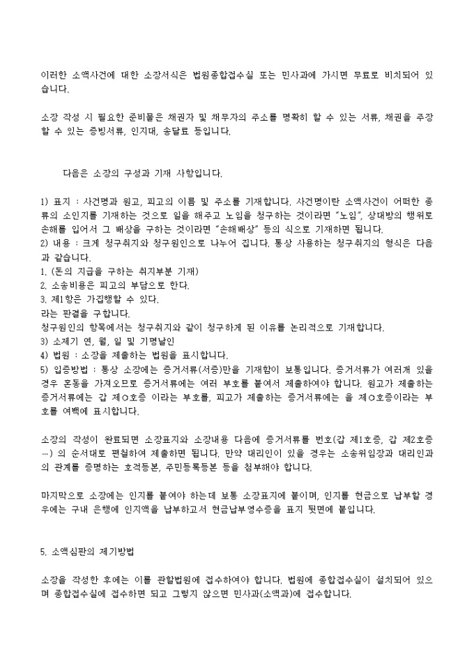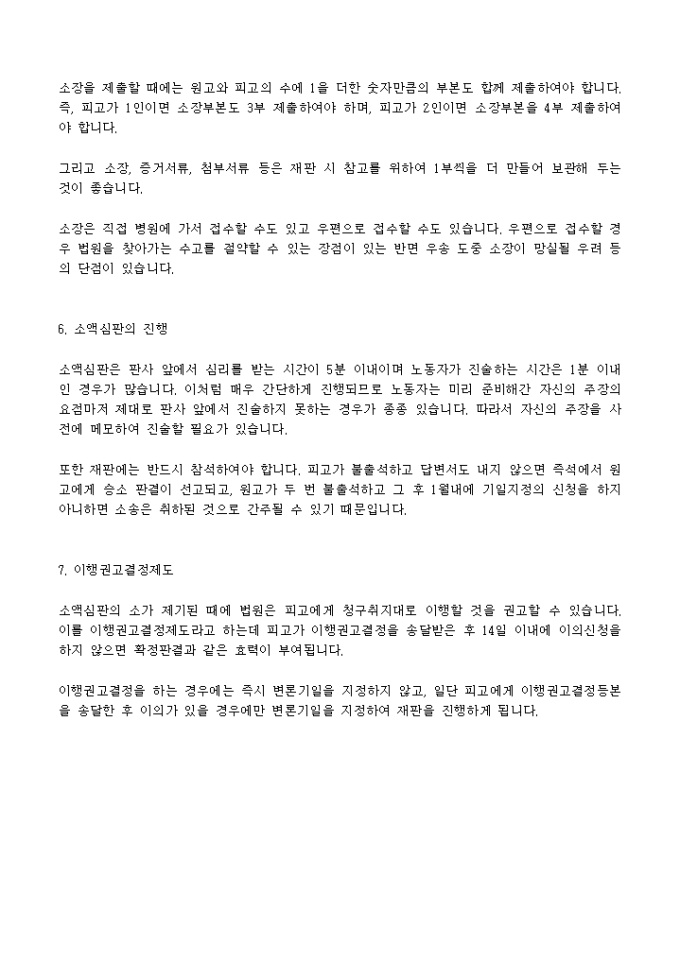 최고장 발송을 통한 당사자간의 해결, 노동부에 체불임금 등에 관한 진정활동 등을 통해서도 체불임금사건이 해결되지 않는 경우에는 민사소송을 통해 해결을 할 수 있습니다. 그러나 민사소송은 소장을 쓰는 것부터 끝날 때까지의 절차가 어려워 변호사나 법무사의 도움 없이는 스스로 하기 어렵고, 비용도 많이 들고 시일도 오래 걸리기 때문에 재판을 꺼리는 수가 많았습니다.