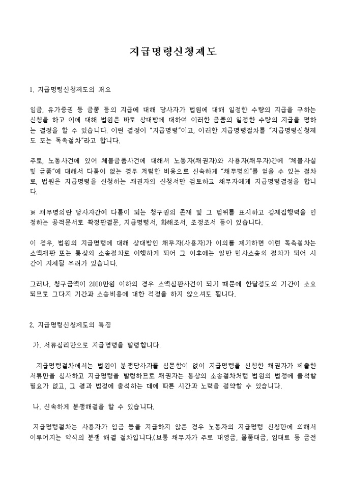 임금, 유가증권 등 금품 등의 지급에 대해 당사자가 법원에 대해 일정한 수량의 지급을 구하는 신청을 하고 이에 대해 법원은 바로 상대방에 대하여 이러한 금품의 일정한 수량의 지급을 명하는 결정을 할 수 있습니다. 이런 결정이 “지급명령”이고, 이러한 지급명령절차를 “지급명령신청제도 또는 독촉절차”라고 합니다.