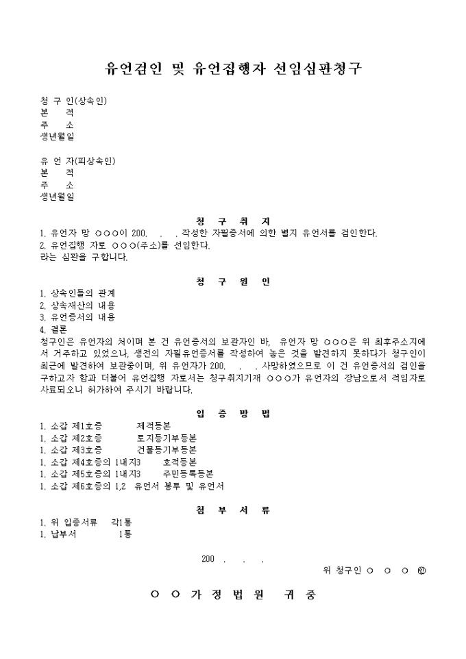 9,000원/월자필증서에 의한 유언서르 검인하고 유언집행자를 선임한다라는 심판을 구하는 유언검인 및 유언집행자 선임심판청구서입니다.