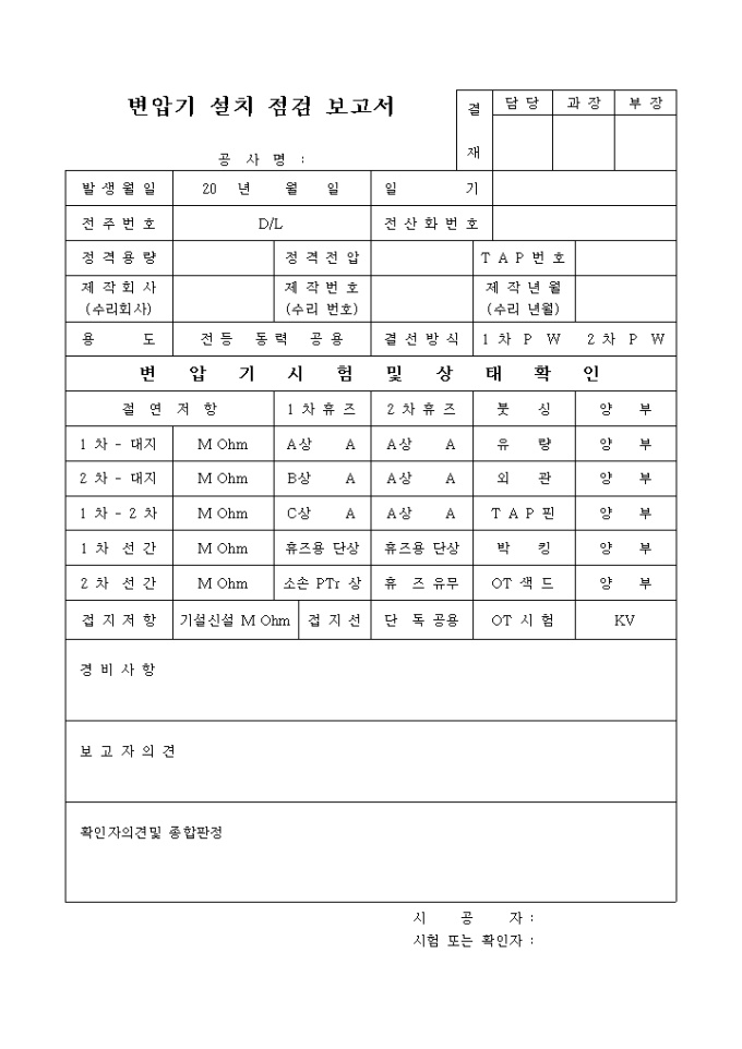 9,000원/월변압기 설치 점검 보고서에 관한 양식입니다. 발생일, 전주번호, 정격용량, 제작회사, 용도, 일기 등과 함께 변압기 시험 및 상태 확인 체크, 경비사항, 보고자 의견, 확인자 의견 및 종합판정 등을 기재합니다.