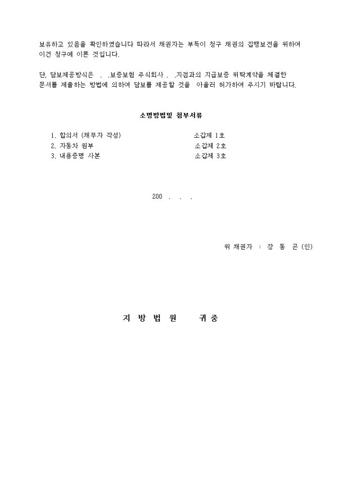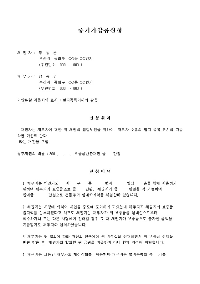 9,000원/월채권자는 채무자에 대한 위 채권의 집행보전을 위하여 채무자 소유의 별지 목록 표시의 자동차를 가압류 한다. 라는 재판을 구하는 내용의 중기가압류 신청서입니다.