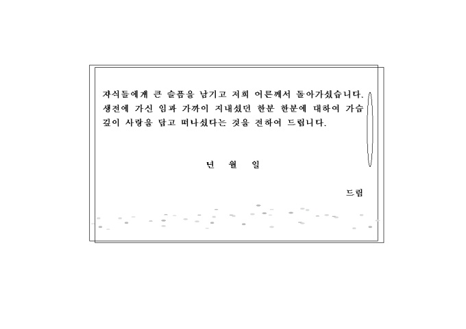 자식들에게 큰 슬픔을 남기고 저희 어른께서 돌아가셨습니다. 생전에 가신 임과 가까이 지내셨던 한분 한분에 대하여 가슴깊이 사랑을 담고 떠나셨다는 것을 전하여 드립니다....... 부고(2) 장 양식입니다.
