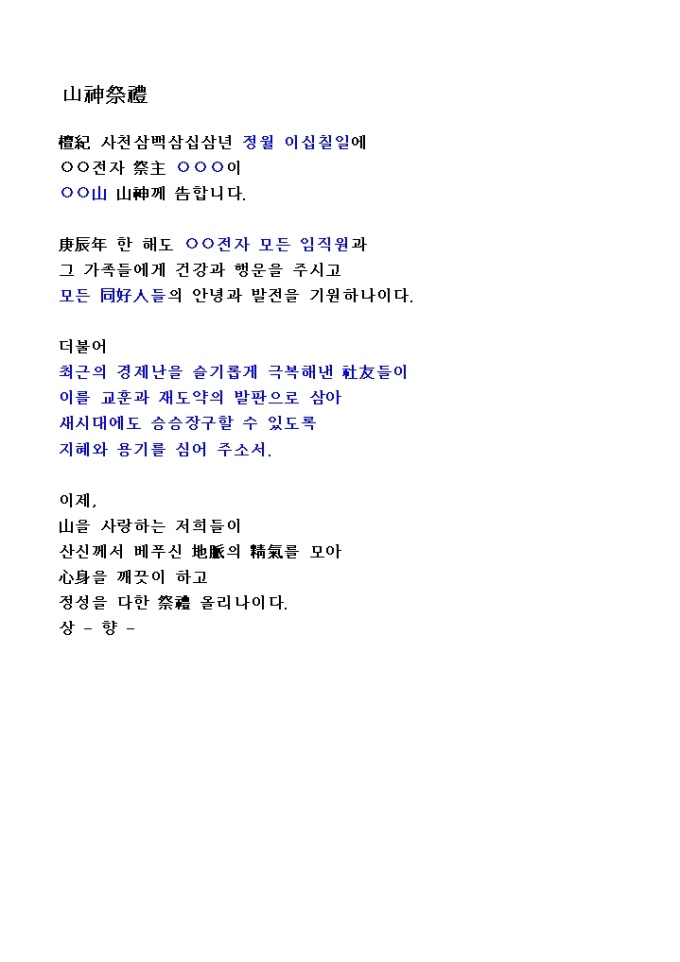 9,000원/월檀紀 사천삼백삼십삼년 정월 이십칠일에 전자 祭主 ○○○이 ○○山 山神께 告합니다...... 산신제예 양식입니다.