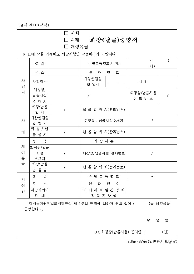 시체,사태,개장유골 화장(납골)증명서 양식입니다.