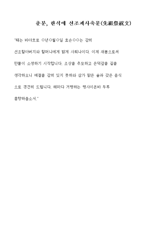 9,000원/월춘분, 한식에 선조제사축문(先祖祭祝文)에 대한 한글제사축문 양식입니다.