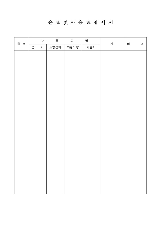9,000원/월손료 및 사용료 명세서 양식입니다. 사용료별(중기, 소형정비, 화물차량, 가설재), 계, 비고 등을 기재합니다.