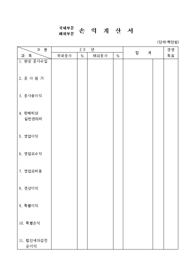 9,000원/월손익 계산서 양식입니다. 완성 공사수입, 공사 원가, 공사 총이익, 판매비와 일반 관리비, 영업이익, 영업 외 수익, 영업 외 비용, 경상이익, 특별이익, 특별 손익, 법인 세차감전 순이익 등을 기재합니다.