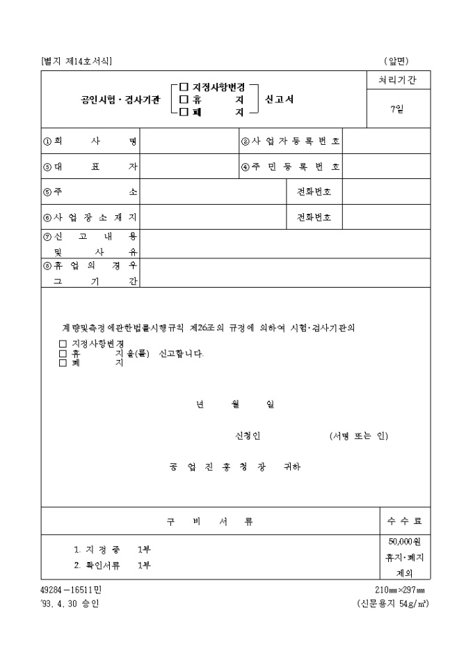 공인시험, 검사기관(지정사항변경, 휴지, 폐지)신고서