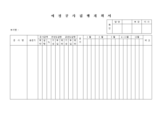 9,000원/월예정 공사 집행 계획서(기본) 양식입니다. 공사명, 총공기, 공사 금액, 전년도 집행, 금년도 집행, 공기, 비고 등을 기재합니다.