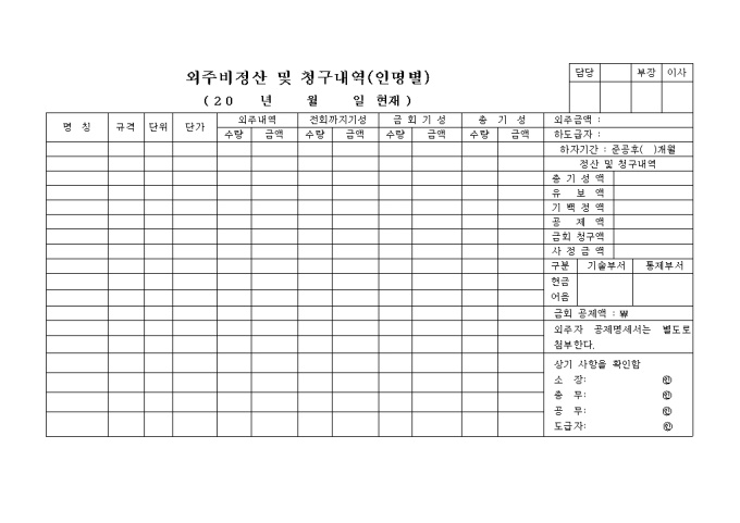 외주비정산 및 청구 내역 양식입니다. 명칭별 규격, 단위, 단가, 외주내역, 전회까지기성, 금회기성, 총기성, 외주금액, 하도급자, 하자기간, 정산 및 청구내역 등을 기재합니다.