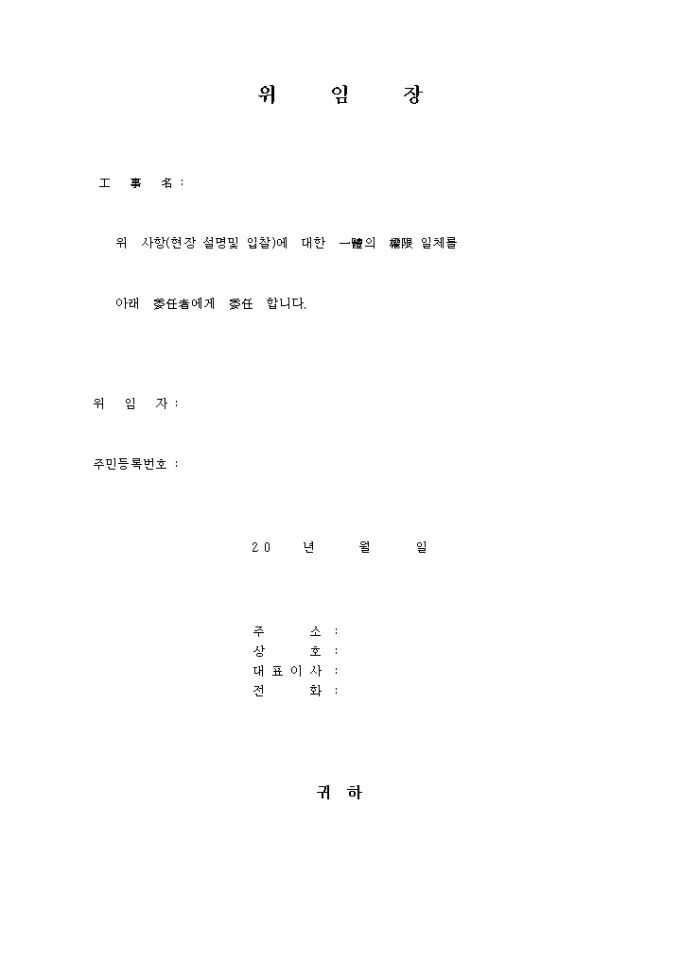 9,000원/월위임장(현장 설명및 입찰)입니다. 위 사항(현장 설명및 입찰)에 대한 一體의 權限 일체를 아래 委任者에게 委任 합니다.