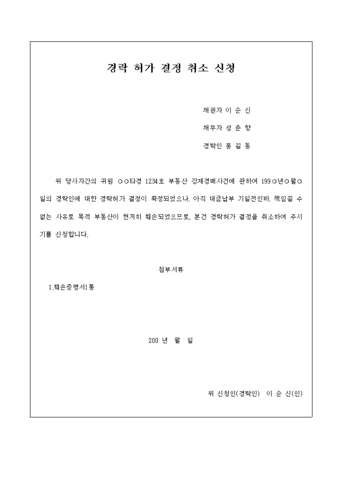 9,000원/월부동산 강제경매사건에 관하여 경럭허가 결정된 부동산이 훼손되어 결락허가 결정을 취소해달라는 내용의 경락허가결정취소신청서입니다.
