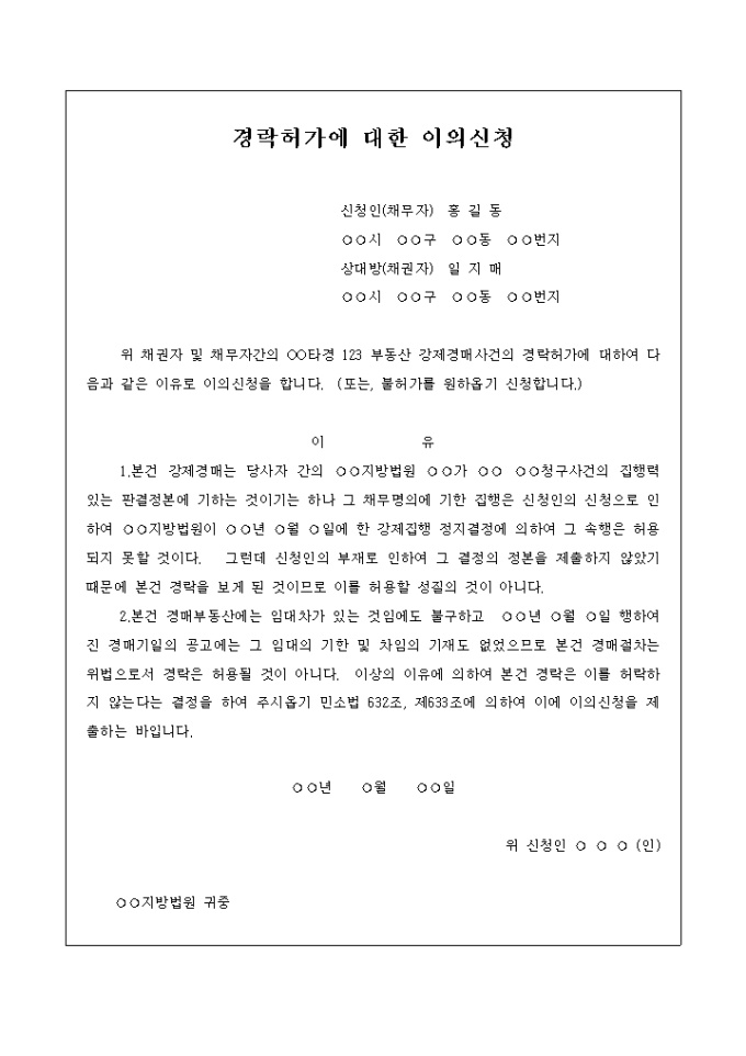 강제경매사건의 경락허가에 대하여 경락허가에 대한 이의신청을 하는 내용의 양식입니다.